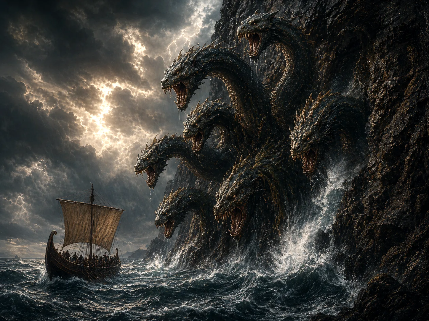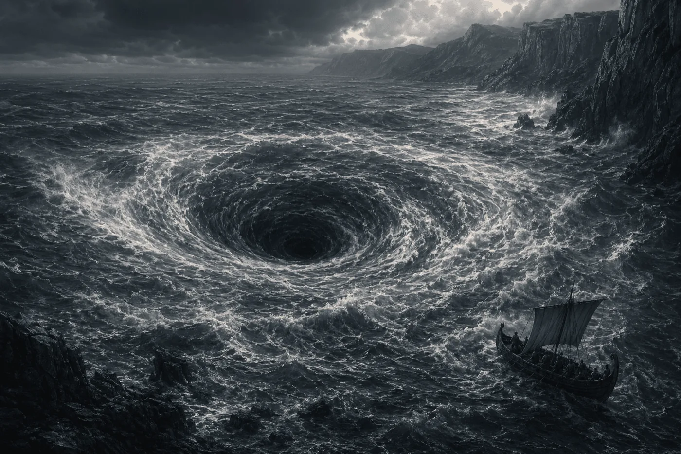 Charybdis is less a beast than a mythic natural catastrophe: the sea itself becomes a trap.