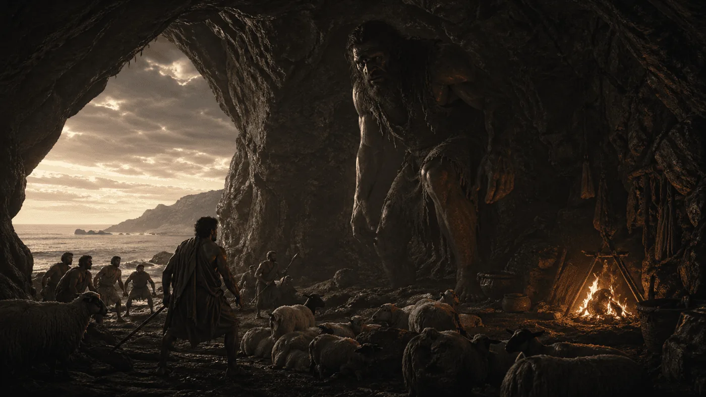 Polyphemus devours Odysseus' companions and, through his wound, triggers Poseidon's long revenge.